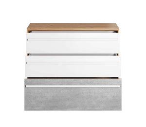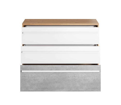 A stylish and modern design chest of drawers finished in a 16mm laminated board decorated with a decorative coating of colours that will blend in any traditional or modern decor. It has three drawers with an artistic set of unusually long handles, accentuating the chest’s creative craftsmanship.