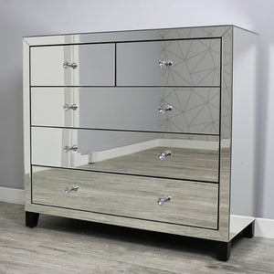 Our simply mirror 5 drawer chest, with simple and minimal design the Simply Mirror collection endures all decor trends and changes while complimenting them, these items will brighten and lift the room with the shiny mirror finish. This stunning collection also has all the appeal of a more budget friendly price point.