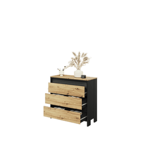 With an industrial flair and modern glamour, this accent chest features three drawers to offer storage for your smaller accessories or living room essentials. It is made from 16mm laminated board with a stunning finishing in black matt and Oak Artisan, accentuated by beautiful natural wood grain to add vintage charm to your existing decor scheme.