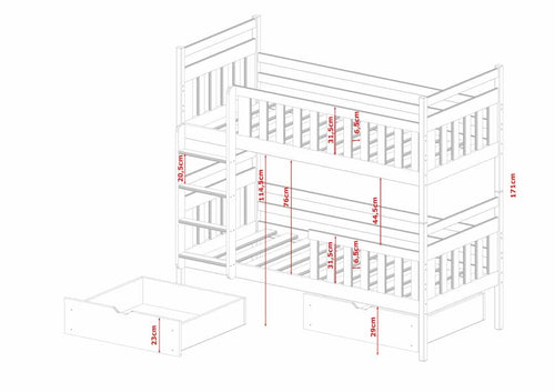 What better way to keep young ones close than with the Monika wooden bunk bed? This cozy unit features two spacious storage drawers underneath the bed, and a universal ladder that can be attached at either side. Moreover, at the upper and lower floors, safety rails will keep the little ones from toppling out, and ensure peace of mind. The Monika bunk bed can be bought with or without a mattress.