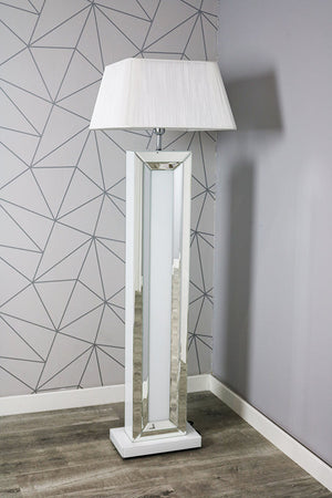 Bianco Floor Lamp stylish addition for any fashion forward room with clean simple, comptemporary design. Features white glass and plain mirror. Well balanced and strong design for duribility. Perfect accompaniment to Bianco Table Lamp.