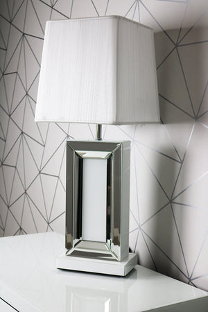 Bianco Table Lamp has cool and comptemporary style with simple clean design that fits into any room. Features white glass and plain mirror. Perfect accompaniment to Bianco Floor Lamp.