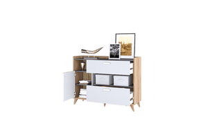 With its modern and elegant design, our Mood MD-05 sideboard is perfect for any modern or contemporary decor. Distinctive features include one hinged door, one open compartment, two shelves and a pair of spacious drawers that provide ample storage space. Finished in a gorgeous combination of colours and made from 16mm laminated board, the cabinet enjoys an abrasion-resistant, incredibly robust carcass.